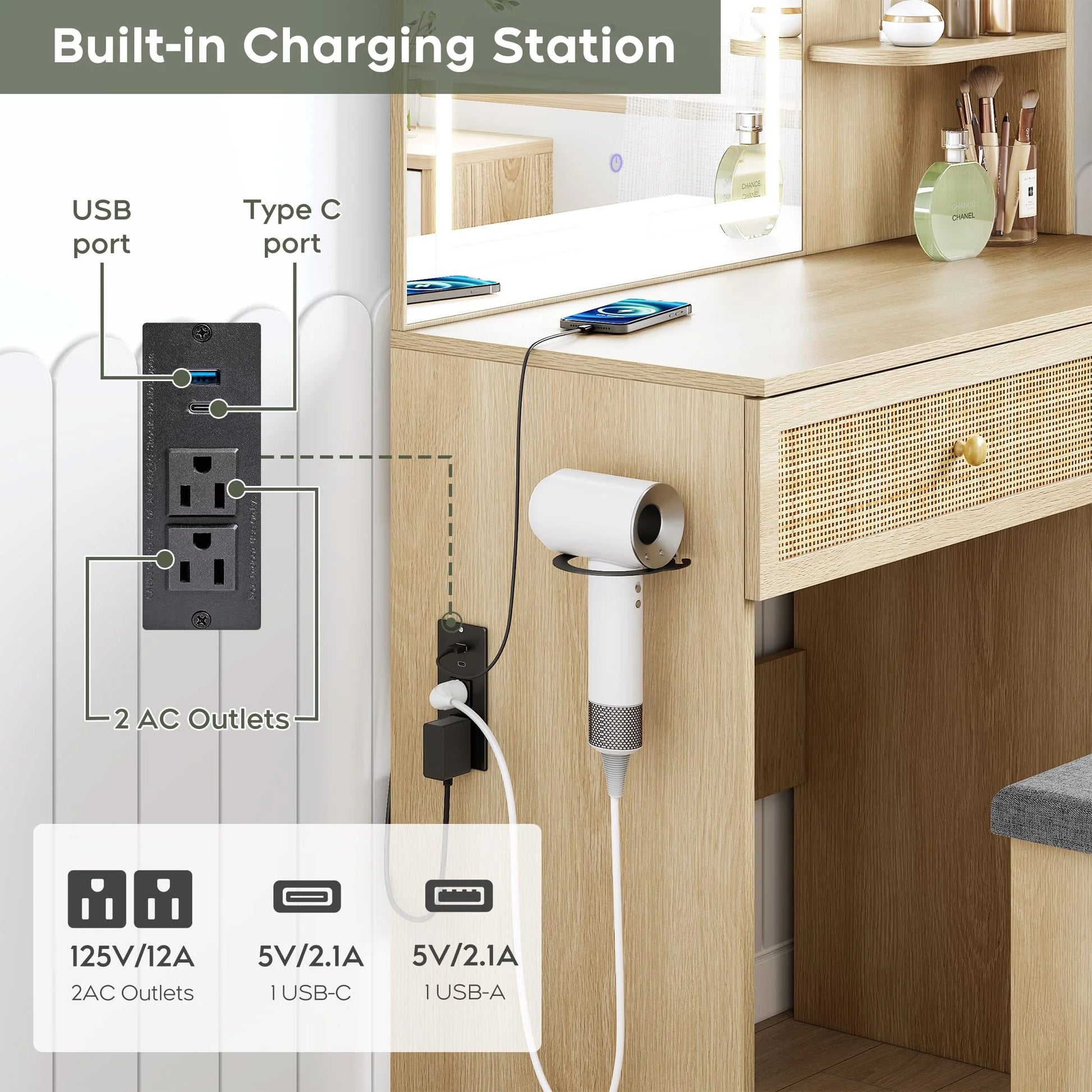 【Sturdy Wooden Board & Natural Rattan Surface Design】Made of environmentally friendly MDF with a retro texture on the surface, it has strong load-bearing capacity and stability, with smooth surface, which is easy to clean. The surface of the drawer is made of hand-woven rattan, which looks very cute when paired with vintage mint boards. This dressing table set with mirrors and LED lights is simple, elegant can perfectly match with your other furniture.