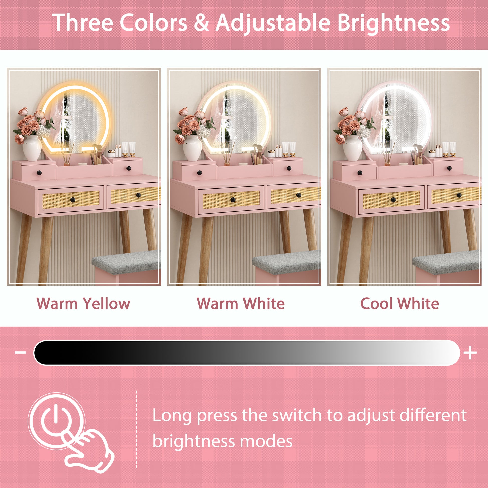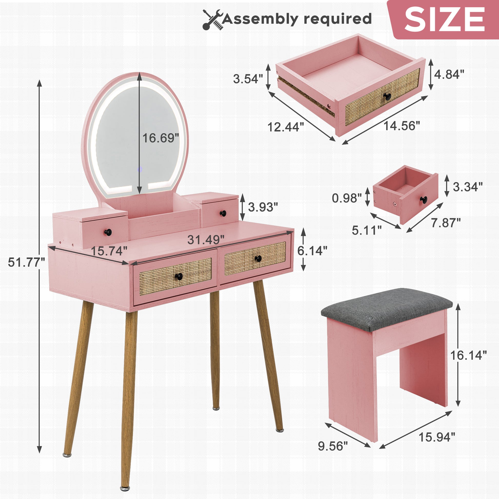 This vintage makeup vanity table set offers a stylish and functional solution for your small space. Crafted with a sturdy wooden board and natural rattan surface, it features ample storage with 2 large and 2 small drawers, as well as a large compartment and tabletop. The adjustable 3-mode LED lighting provides the perfect ambiance for your makeup routine, while the stable steel legs and wood grain accents ensure a durable and visually appealing design. Includes all necessary tools and instructions for easy assembly, plus a worry-free purchase with professional customer support.