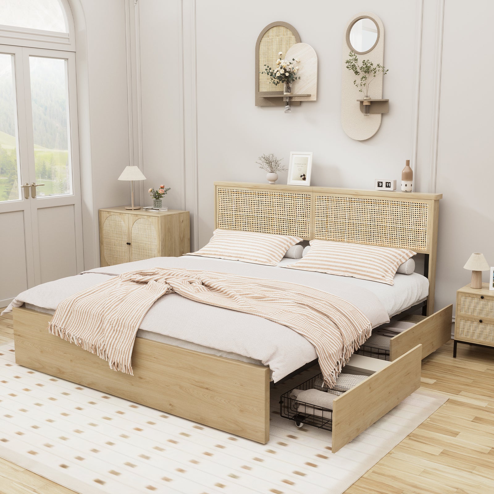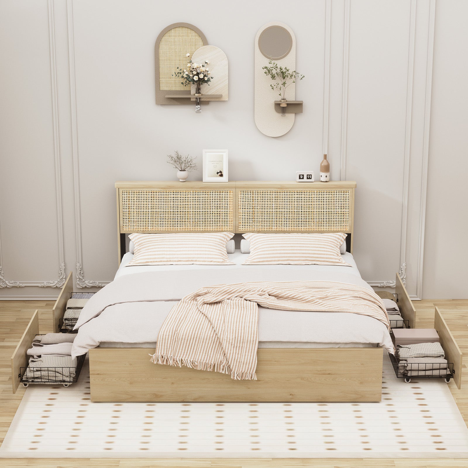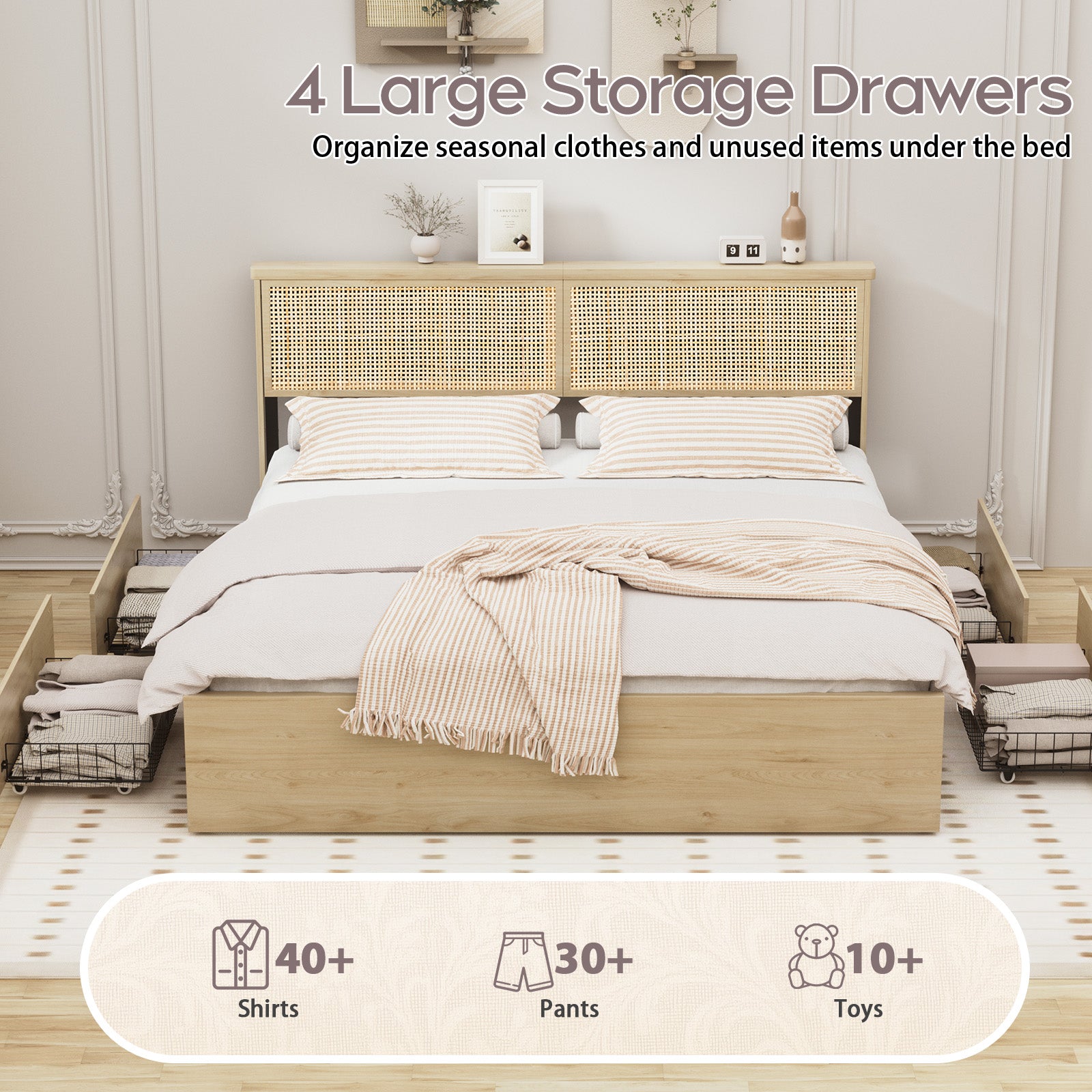 Brafabhome Rattan Bed Frames with Headboard, Wood Platform Bed Frame with 4 Storage Drawers, Mattress Foundation Noise-Free | Beige