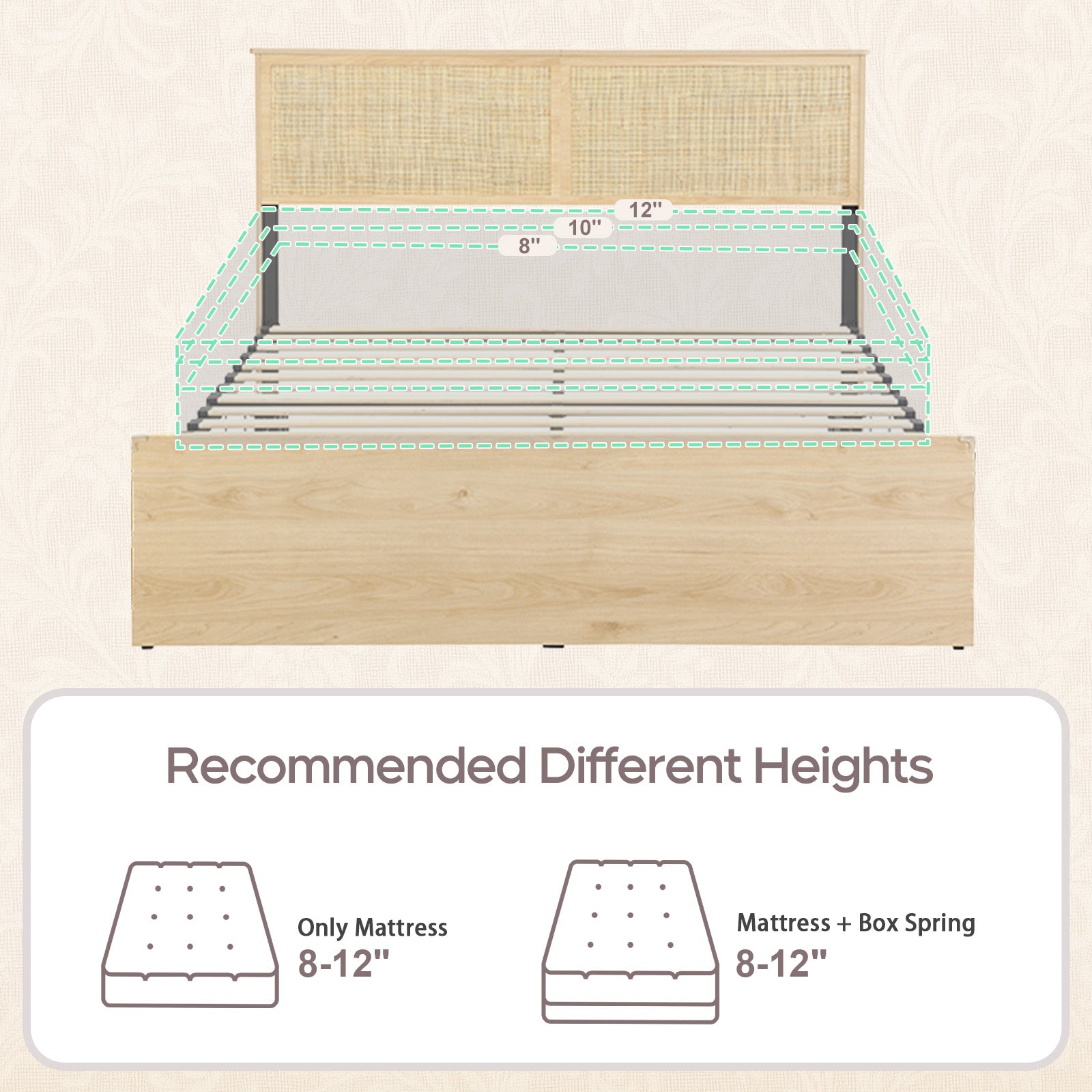Brafabhome queen size platform bed frame with a metal frame and solid wood slats support combined to provide a solid foundation for all peoples with a good night's sleep. This bed frame features a modern design of hand-woven natural rattan headboard making your bedroom elegant and warm. The queen bed frame with 4 drawers provides you plenty of space to keep your stuff like bedding, clothing and other essentials. Clear manual, all screws,tools are offered in the package. The assembly of this bed frame is easy.