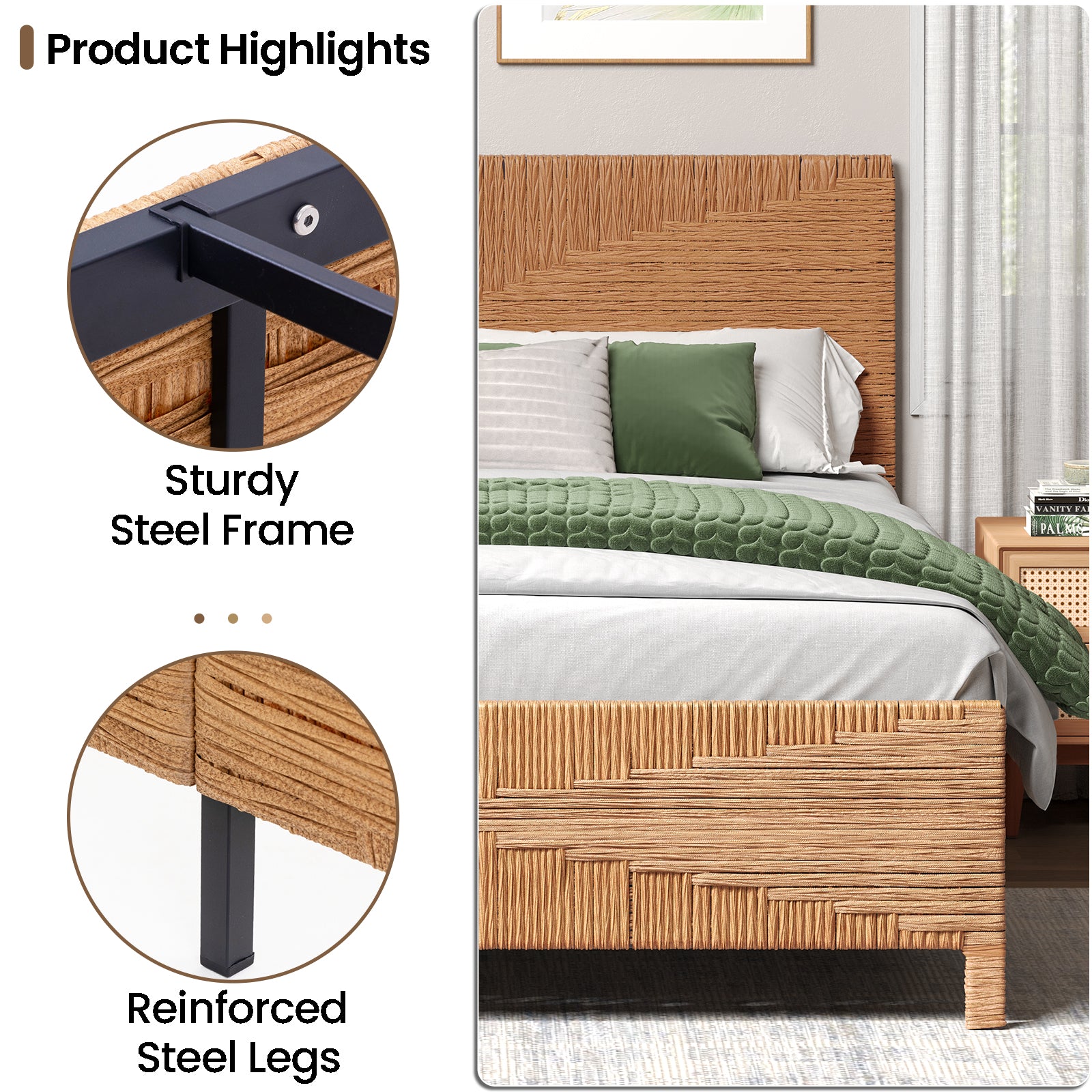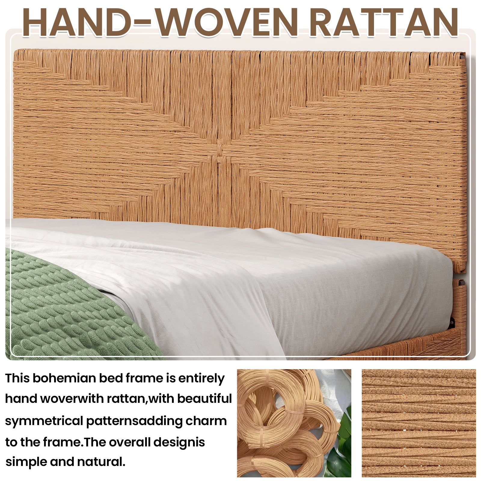 Brafabhome Bohemian Bed Frame with Hand-Woven Rattan Headboard and Footboard, No Box Spring Needed, 1000lbs